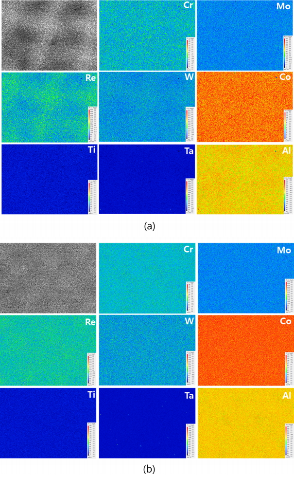 성장시켜 응고 거동 및 미시편석에 대한 연구하였으며, 50 μm/s와 160 μm/s의 응고 속도에서 성장시킨 단결정을 열처리 후 용질원소의 재분포와