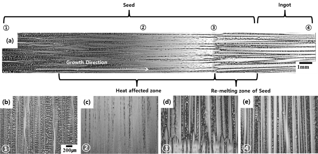 것을 확인할 수 있다(그림 4(a)). 불균일하게 생성된 핵들도 수지상으로 성장할 수 있는 시드가 될 수 있으며, 단결정 시드와 경쟁하여 성장하게 된다. 본 실험의 경우 그림 4(b)에 나타낸 것처럼 단결정이 성장되었으며, 성장 방향은 단결정 시드와 동일한 방향임을 확인할 수 있었다 [15].
