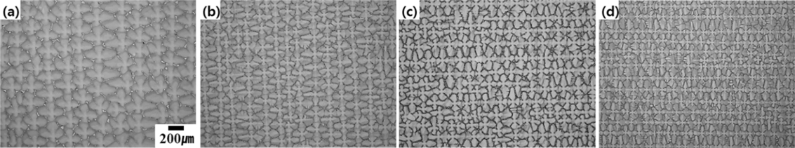 선명도가 낮아진 것을 확인할 수 있었다(그림 2(c)). 그림 2(d)에서 초기 안정화된 계면을 확인할 수 있으며, 응고속도 50 μm/s로 성장시켰을 때 조성적 과냉(constitutional undercooling)에