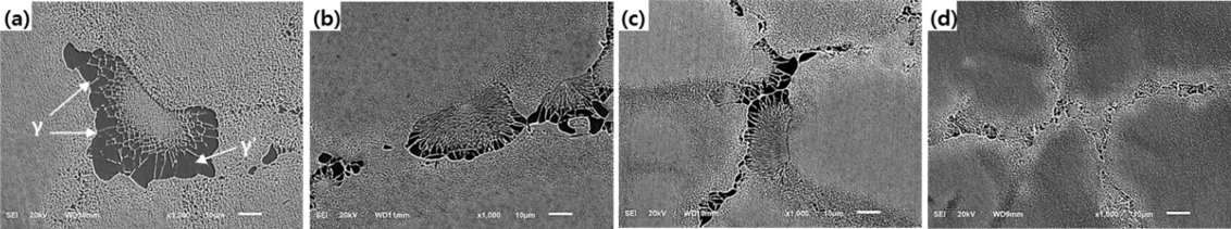 미세한 γ/γ 공정상이 균일하게 분포하며 γ/γ 공정상 내의 γ 상의 크기가 작아지는 것을 확인할 수 있었다.