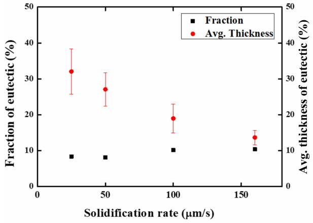 크기는 작아 지면서 공정상 내에 조대한 γ 의 크기가 현저하게 작아지는 것이 관찰되었다. γ/γ 공정상의 평균 두께와 면적 분율을 그림 8에 나타내었다. γ/γ 공정상의 평균 두께는 응고속도가 증가할수록 선형적으로 감소하는 것을 알 수 있으며, 면적 분율은 합금 조성에 의존하기 때문에