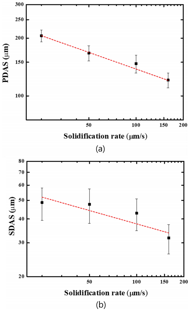 수지상 간격(Primary dendrite arm spacing, PDAS) 및 2차 수지상 간격(Secondary dendrite arm spacing,