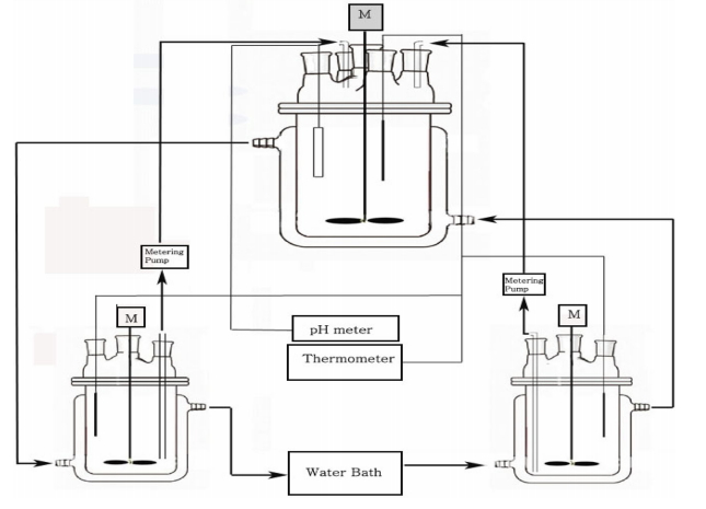 항온수조, 3) 정량펌프, 4) 기계식 교반기, 5) pH미터, 6) 온도계로 구성된다. 탄산가스의 유입에 의한 영향을 배제하기 위하여 각 반응조의