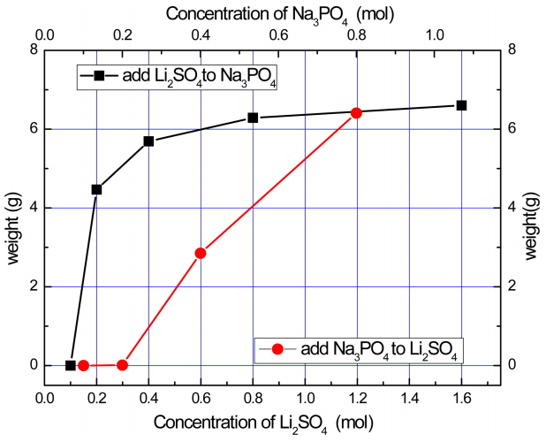 Relationship between weight of precipitated Li3PO4 and concentration of salt(Li2SO4 or Na3PO4).