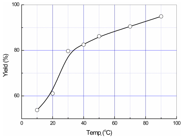 반응 온도에 따른 수율변화를 나타낸 그림 5의 결과에서 인산리튬의 수율은 반응온도의 증가에 비례하여 급격히 증가함을 알 수 있다. 즉, 10℃에서 54% 정도의 수율을 나타내지만 90℃에서는