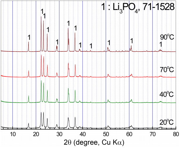 또한 20℃에서 생성한 인산리튬의 회절선에서는 반가폭[17](Full Width at Half Maximum, FWHM)이 매우 커서 결정립의 크기가 미세하고 결정화도가 낮음을 반영하고 있으며, 90℃에서