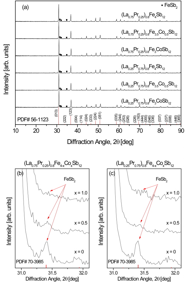 formation of the FeSb2 phase was inhibited with increasing Co content. In our previous study, (La,Pr)Sb2 phases were observed in the fully-filled La1-zPrzFe4-xCoxSb12 specimens, exceeding the FFL [21]. However, in the present study, the partially-filled (La1−zPrz)0.8Fe4-xCoxSb12 skutterudites did not produce (La,Pr)Sb2 secondary phases. Therefore, it was confirmed that the (La,Pr)Sb2 phase was not formed when the partial filling did not exceed the FFL.