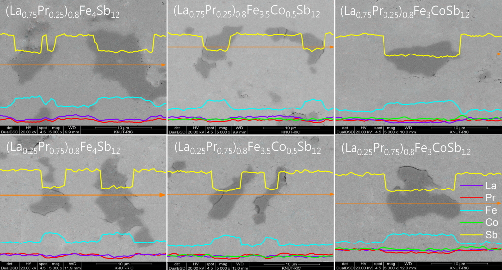 Figure 2 shows the SEM images and EDS line scans of (La1−zPrz)0.8Fe4−xCoxSb12. The FeSb2 phase (dark region) was formed with the skutterudite phase (bright region), but the