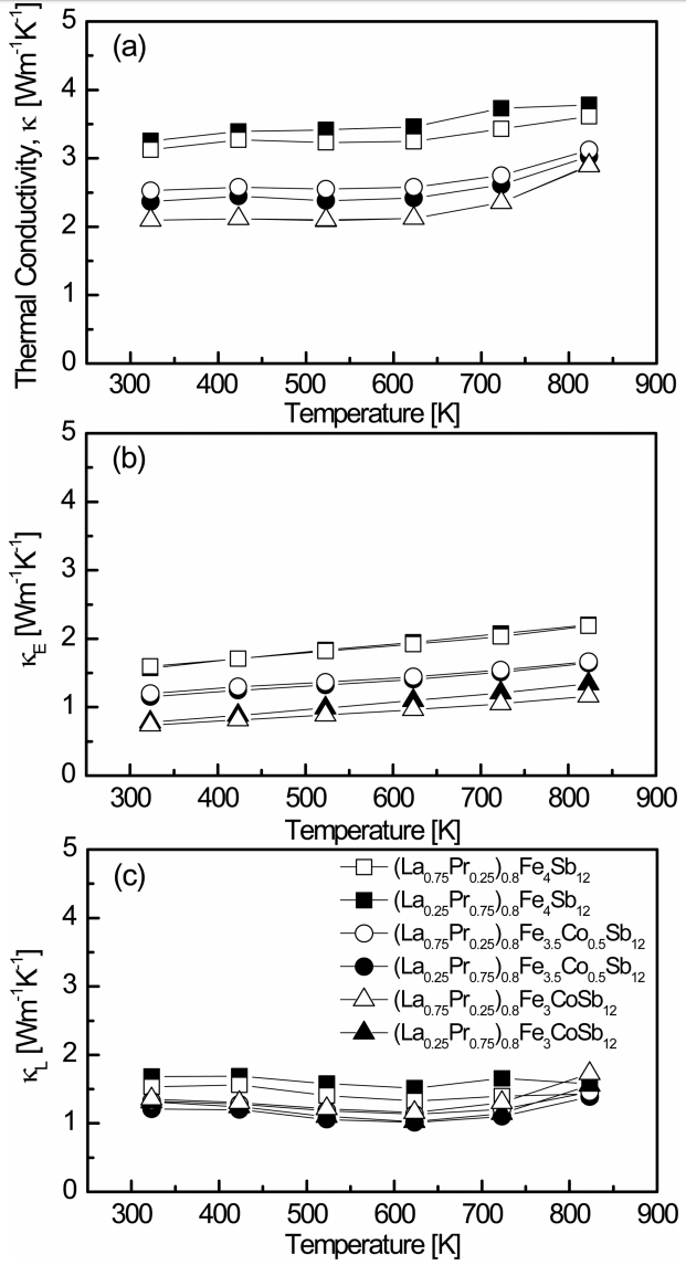 Figure 6 shows the temperature dependence of the thermal conductivity for (La1−zPrz)0.8Fe4−xCoxSb12. The thermal conductivity (κ) is the sum of the lattice thermal conductivity (κL)