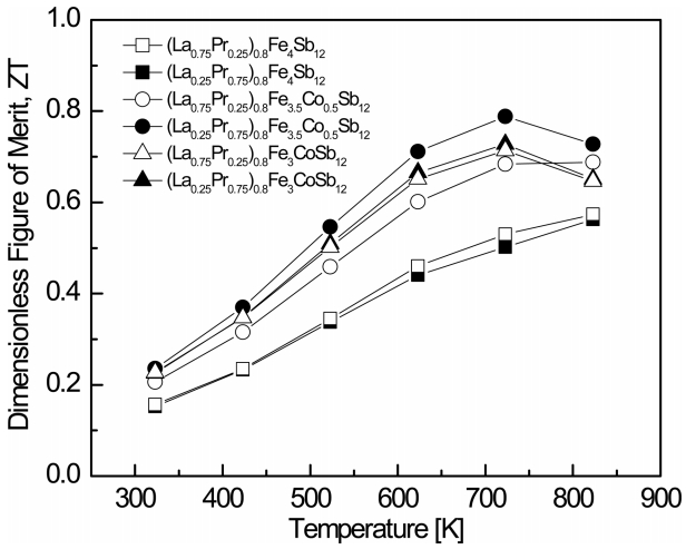 between 723 and 823 K for the Co-substituted specimens. The (La0.25Pr0.75)0.8Fe3.5Co0.5Sb12 showed the maximum ZT = 0.79 at 723 K. However, the fully-filled La0.75Pr0.25Fe4Sb12 showed the maximum ZT = 0.83 at 823 K. In this study, La and Pr were used as filling