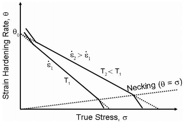 인장 시험 시, 변형율 속도가 빠르면 응력은 높게 나오며, 시험 온도가 낮으면 응력이 높게 나오는 현상과 동일하게 이해할 수 있다. 그림 1의 유동 곡선을 그림 3과 같은 형태로 변화시켰을 때, 다양한 변형율 속도와 온도에 따라 다양한 변형경화율을 가지며, 이는 접선의 기울기로 나타난다. 이 기울기는 동적인