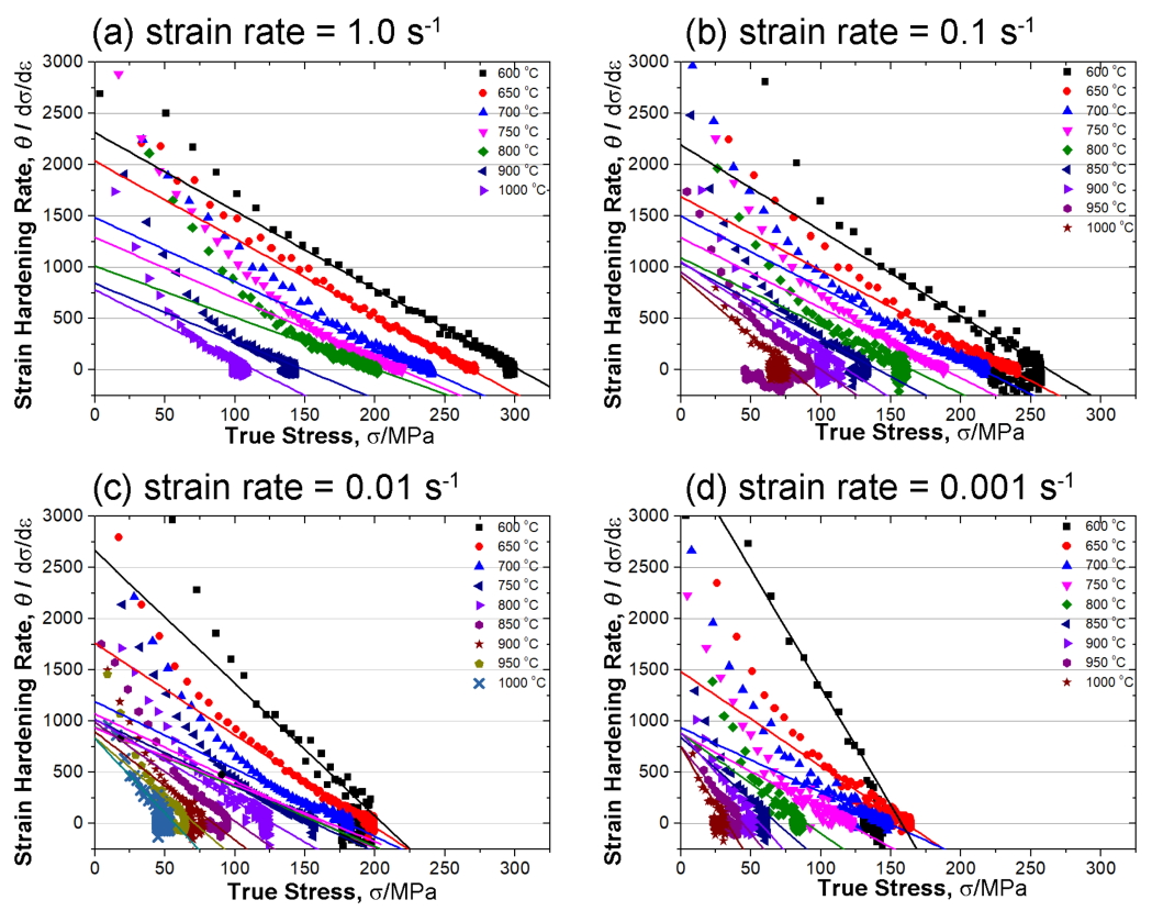 그림 4는 그림 1에서 나타난 유동 응력 곡선들을 이용하여 변형경화율과 진응력로 다시 나타낸 것이다. 그림 3에서 본 것과 같이 직선이 나오는 구간을 활용하여 χ2 비교 후 외삽을 실시하였다. 그림 4d와 같이 변형율 속도가 느린 경우, 600도 혹은 650도를 제외한 고온 실험의 외삽값이 그림 3에서 본 것과 같이 세로축의 한 점(θ0)으로 수렴하는 것을 볼 수 있다. θ0는 약 850 MPa 근처임을 알 수 있다. 동적 재결정이나 동적 상변태과 같은 급격한 연화가 발생되지 않는다고 가정한다면, 앞서 언급하였듯이 다양한