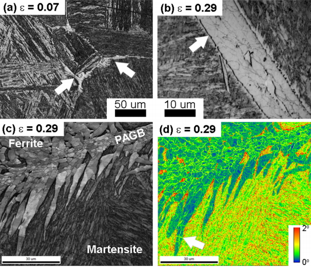 구 오스테나이트 결정립계 주변을 차지하고 있다. 이는 그림 2에서 보듯이 초기 페라이트 핵생성 구간이며 최대 유동 응력에 도달하기 전 상태이다. 소성 변형 중, 가장 높은 결함 에너지를 가지는 오스테나이트 결정립계에