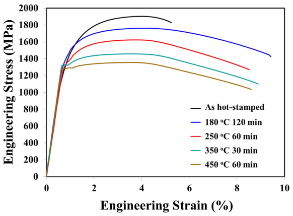 ํ์ฌ ์๋์ฐจ์ ์ ์ฉ๋๊ณ ์๋ ํซ์คํฌํ ๊ฐํ์ผ๋ก๋ ๋ณด๋ก (B) ์ด ์ฒจ๊ฐ๋ 22MnB5 ์ฌ์ง์ด ๋ํ์ ์ด๋ค [12,13]. ํฉ๊ธ ์ฑ๋ถ ์ค B, C, ๊ทธ๋ฆฌ๊ณ Mn์ ์ค์คํ