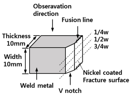 시편)에서 각각 표준 샤르피 충격시편을 채취한 후 FL 및 FL에서 모재쪽으로 1 mm 떨어진 곳 (FL+1)에서 V노치를 가공하였다. 충격시험은