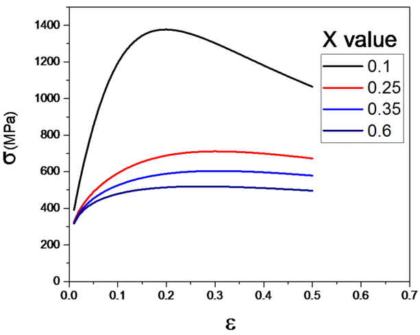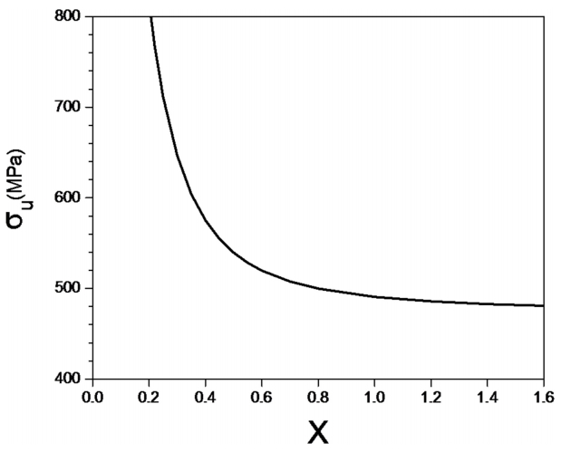 그림 10에 이러한 가정으로 계산한 σ−ε 곡선을 몇몇 상대두께 X에 대하여 나타내었다. 각 X에서 최대인장강도를 그림 11에 나타내었다. X가 약 1 이하에서 연화영역의 최대인장강도는 증가하기 시작하여 약 0.5에서 모재 강도인 550 MPa에 도달한다. 따라서 약 15 mm 연화영역의