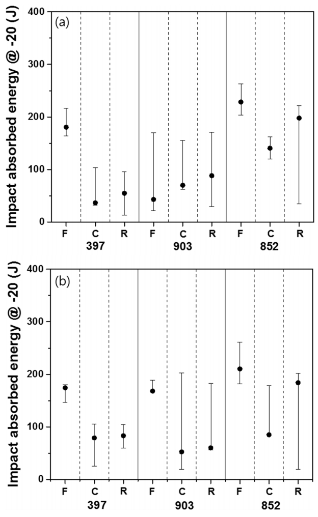전반적으로 Nb가 첨가된 397과 903강이 첨가되지 않은 852강 보다 인성이 낮으며, center나 root에서 채취한 시편이 face에서 채취한