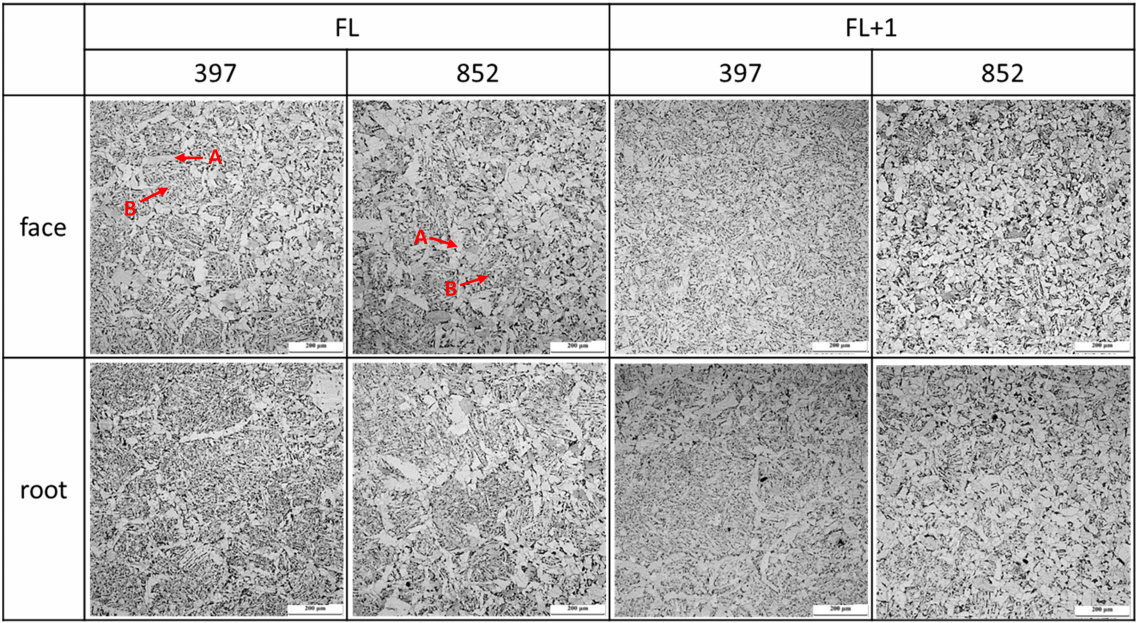 시편보다 인성이 낮은 경향을 보인다. 이러한 원인을 조사하기 위하여 먼저 광학현미경 조직관찰을 행하였다. 그림 3에 대표적으로 Nb 첨가강인 397강과 Nb 무첨가강인 852강을 대상으로 face와 root에서 채취한 시편의 FL과 FL+1에서의 조직을 비교하였다.