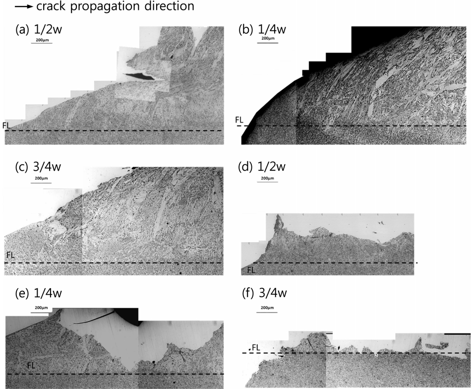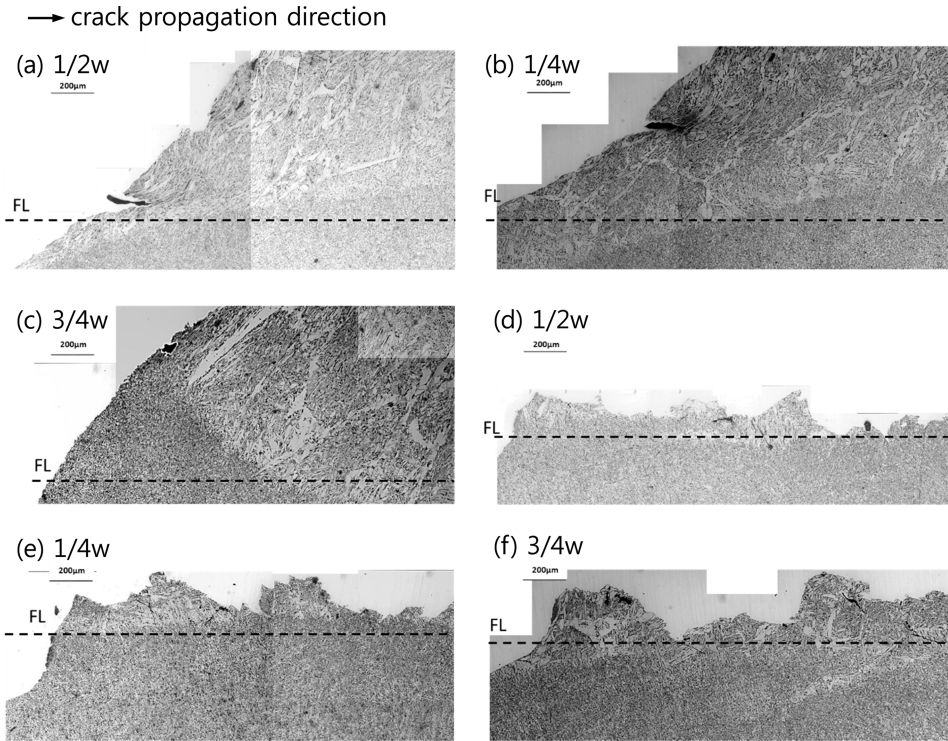 균열이 전파하고 있음을 보여준다. 이때 세 위치 모두에서 FL 인근에서 조직은 입계페라이트가 형성된 베이나이트와의 혼합조직을 나타내고 있다. 한편