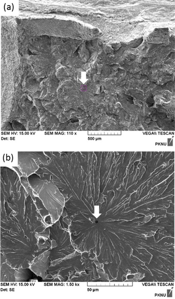 한편 이런 조직적인 요인 이외에 취성파괴의 발생장소가 되는 비금속개재물의 존재도 인성 편차의 또 다른 요인이 된다. 그림 8에는 FL+1 시편에서 903강 root에서 채취한 시편 중 60 J의 낮은 흡수에너지를 나타내는 시편의 파면을 SEM으로 관찰한 결과를 나타내었다.