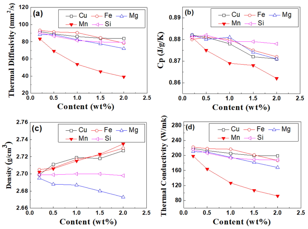 것이라 볼 수 있다. 예컨대 용탕의 유동성 및 주조성 향상을 위한 Si 첨가 [4], 강도 및 가공성 향상을 위한 Cu 및 Mn 첨가 [5-7], 금형의 소착 저항성 향상을 위한 Fe 첨가 [8] 등 Al에 첨가되는 상기 미량 금속원소의 양이 증가할수록 제품의 열물성은 열화된다. 따라서 다이케스팅 주조가 가능하고 방열특성이 우수한 Al 합금
