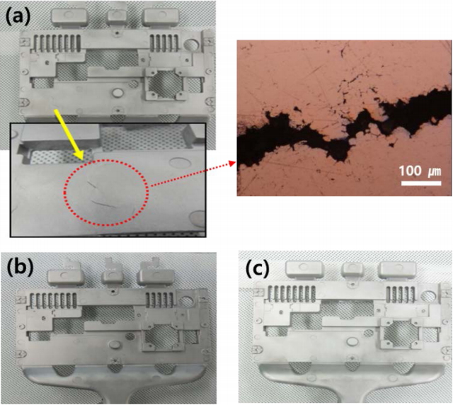 각각 0.8 및 2.5 m/sec로 제어하였다. 그림 10은 상기 조건으로 다이캐스팅 제조된 방열 부품의 외관을 나타낸다. Si 함량이 1.5 wt% 이하인 합금 조성에서는 공통적으로 그림 10(a)와 같이 제품표면에 균열이 발생하였다. 이 결함은 임계온도 구간에서 액막에 의해 약해진 결정립계가 수축응력 및 구속력을 견디지 못해 발생하는 입계균열(Intergranular