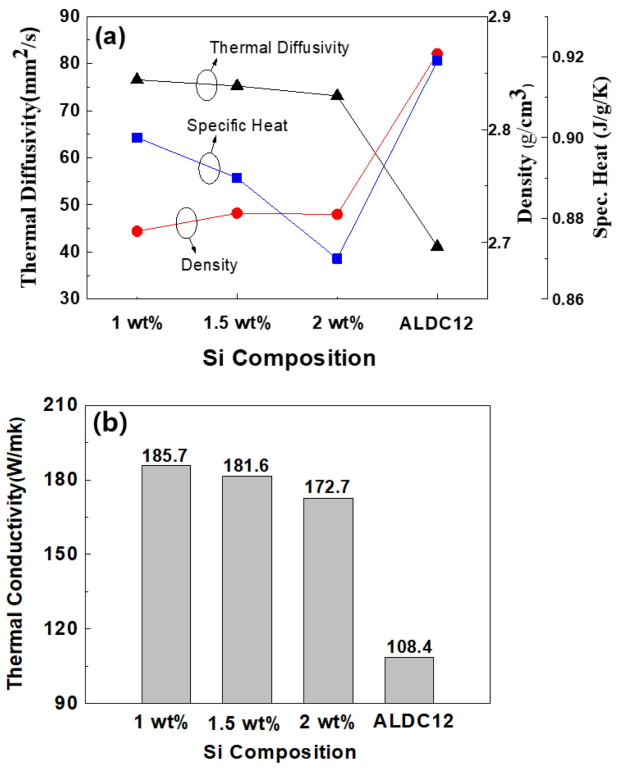Si 함량변화에 따른 Al 합금의 열전도성 변화를 관찰하기 위해 제조된 시험편에 대한 열확산계수를 측정하였다. 그림 8(a)는 각각의 시험편에 대한 열확산계수, 비열 및 밀도 값을 나타낸다. 예상한 바와 같이 Si의 함량이 증가함에 따라 시험편의 열확산계수는 서서히 감소하였으며