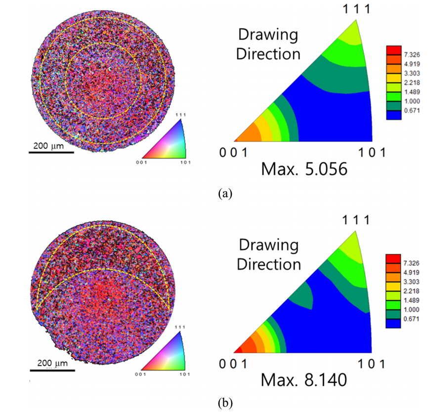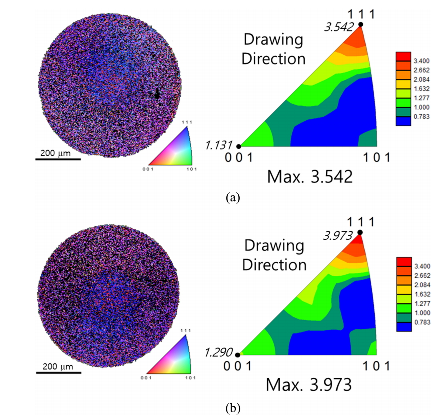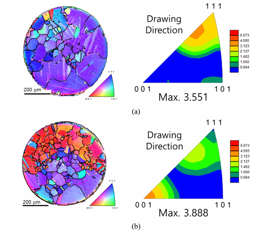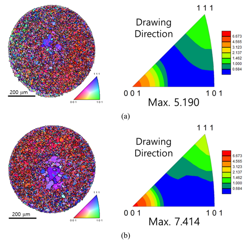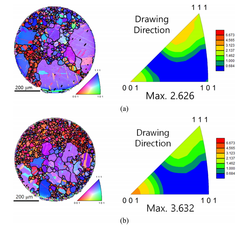 각 신선 공정 조건을 거친 두 선재들의 EBSD를 이용하여 측정된 단면 미세조직과 변형 집합조직을 그림 1에 나타내었다. 단면 미세조직 그림에서 결정립의 크기 및 형상과 함께 색을 통해 해당 결정립의 신선방향에 대한 결정방위를 알 수 있다 (파란색: <111>//DD,