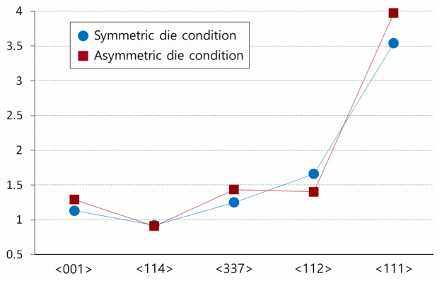 90% 신선 후 <111>/<100> 비율이 약 2.6으로 보고된 바 있다 [13]. 본 연구에는 그 비율이 두 선재에서 모두 약 3.1 이었다 (정규 대칭 다이 조건: 3.542/1.131, 비대칭 다이 조건: 3.973/1.290).