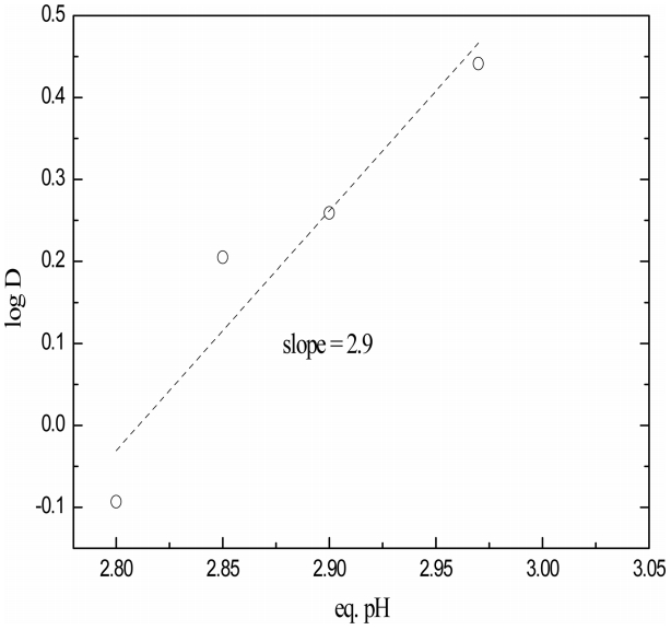 실험한 결과를 그림 1에 나타냈다. 이때 테르븀의 농도는 100 ppm으로 조절하였다. 그림 1에서 수상의 평형 pH와 테르븀 분배계수의 대수치가 직선적인 관계를 나타내며 그 기울기는 2.9로 식 (4)와 잘 일치하였다. Cyanex 272의 농도 변화에 따른 테르븀의 추출 거동을 조사하기 위해 테르븀의 농도가 100 ppm인 용액의 초기 pH를