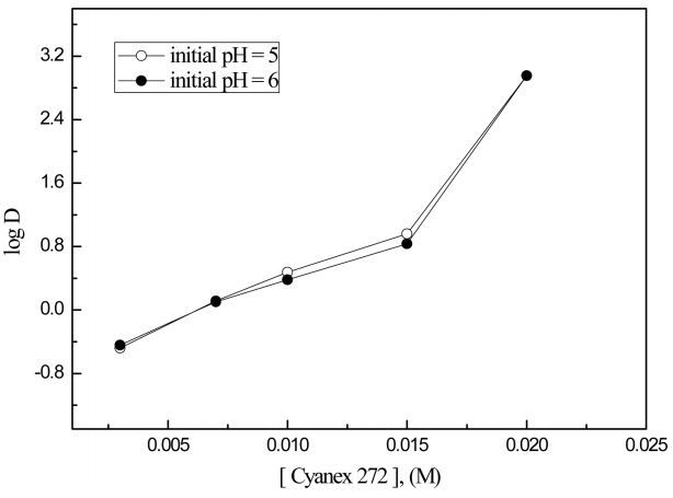 5와 6으로 조절하였다. Cyanex 272의 농도를 0.003 M에서 0.02 M까지 변화시켜 추출 실험한 결과를 그림 2에 나타냈다. Cyanex 272의 농도가 증가함에 따라 테르븀 분배계수의 대수치가 큰 폭으로 증가하였다.