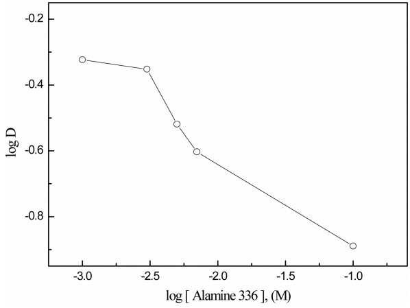 추출반응에 참여할 수 있는 Cyanex 272의 농도가 감소했기 때문이다. Alamine 336은 3차 아민으로 비공유전자쌍을 지니고 있으며 수소이온이