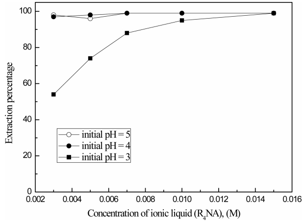 농도에 비해 Alamine 336의 농도가 과잉으로 존재하면 Alamine 336에 의해 수소이온이 추출되면서 수용액의 평형 pH가 증가하였다. 이와