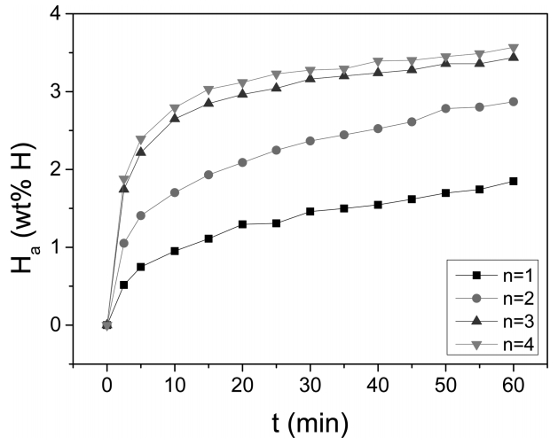 to four, the initial hydrogenation rate and Ha (60 min) increased. In n=4, the initial hydrogenation rate was 0.12 wt% H/min and