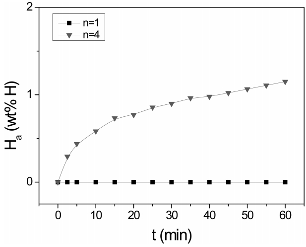 The Ha versus t curves at 573K in 12 bar H2 in n=1 and n=4 for Mg after reactive milling are shown in Fig 8. In n=1, Mg after reactive milling did not absorb hydrogen. As n increased from one