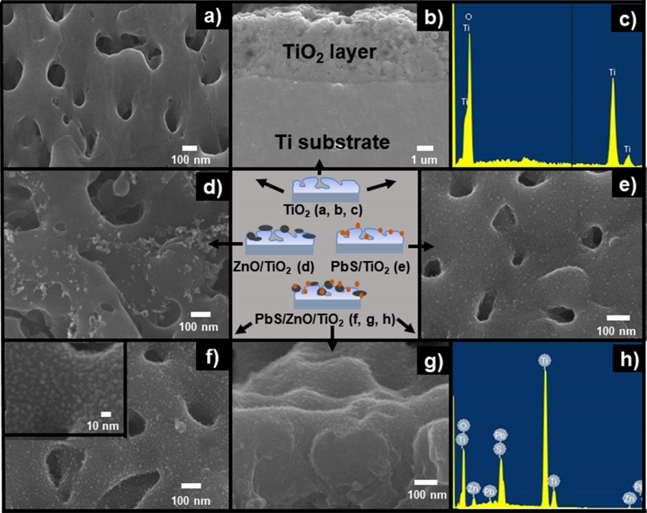 Figure 2(f) shows the surface morphology of the PbS/ZnO/TiO2 photocatalyst, and the inset in Fig 2(f) shows the magnified morphology, while Fig 2(g) shows the morphology of a cross-sectional area of the PbS/ZnO/TiO2 layer. Figure 2(f) and 2(g) show that the PbS and ZnO fine particles were precipitated homogeneously on the TiO2 surface, as well as on surfaces inside the pores.