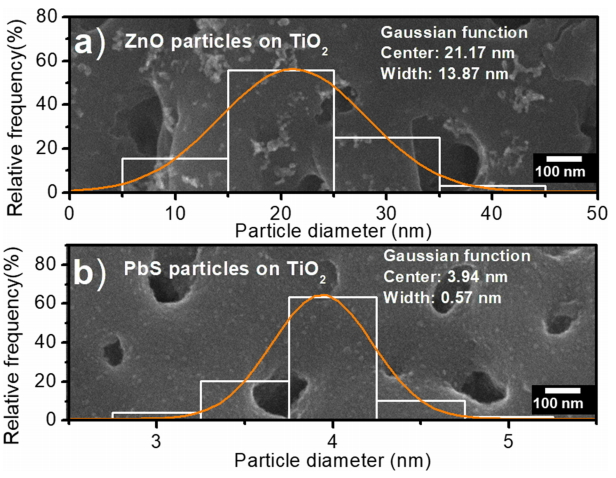 the size and distribution of the ZnO and PbS nanoparticles on the TiO2 surface were estimated using the Gaussian function, and the results are shown in