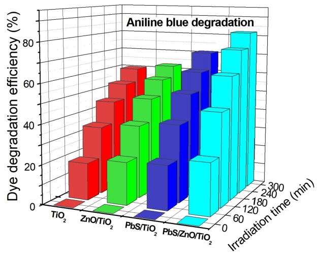 The PbS QDs/ZnO/TiO2 heterojunction photocatalyst showed a higher Aniline blue decomposition rate and