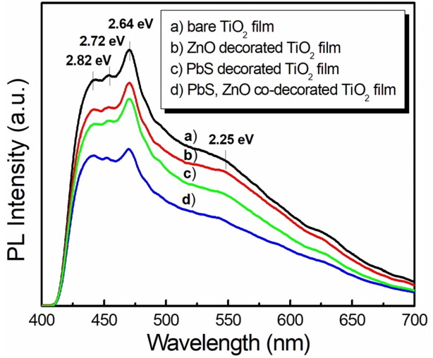 the photoluminescence (PL) spectra of the TiO2, ZnO/TiO2, PbS/TiO2, and PbS/ZnO/TiO2 photocatalysts were measured in the wavelength range of 400-700 nm, and the results