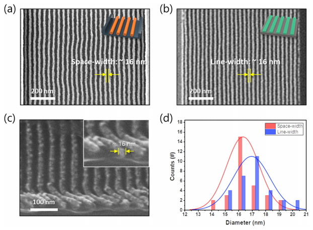 먼저, 블록공중합체 자기조립 공정으로 초기 템플릿을 제작하였다. 그림 2 (a)는 PS-b-PDMS 블록공중합체의, 용매 어닐링 공정 진행한 후의 SEM 이미지이며, 16 nm 선폭 및 선 간격을 갖는 정렬성이 우수한 SiOx 라인 구조가 형성되었음을 확인하였다. 해당 구조물을 템플릿으로 활용하여 패턴전사 프린팅 공정을 진행하였고, 프린팅된 16 nm Pt 라인 패턴의