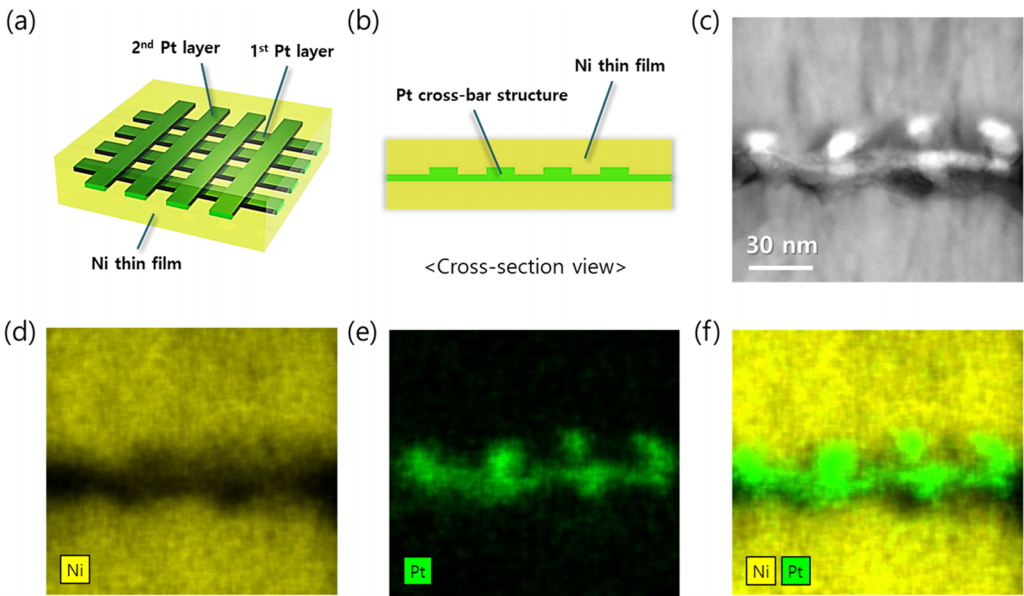해당 공정을 활용하여 Pt 다공성 크로스-바 구조체를 Ni 박막 위에 형성하였으며, TEM 및 EDS 분석을 실시하였다. 그 결과, Ni/Pt 하이브리드