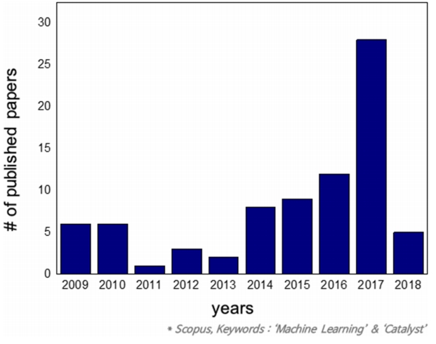 학습을 통해 그동안의 연구자들이 생각하지 못했던 촉매 후보군을 빠르게 찾을 수 있다고 기대할 수 있다. 그림 3에 나타낸 출판 논문 수에서 볼 수 있듯이 기계 학습을 활용한 연구가 급격히 증가하고 있음을 알 수 있다.