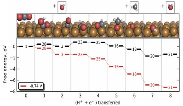 실제로 CHE모델은 전기화학 촉매에 대한 제일원리 연구에 널리 사용되고 있으며, 그림 4는 CHE모델을 이용한 전기화학촉매 메커니즘 규명의 대표적인 예로, 메탄에 의한 이산화탄소 환원에 관한 연구사례이다 [21]. Zero voltage에서 free energy diagram과 CHE모델을 이용하여 전압을 인가하면서 각 수소화 단계를 도식화하고, 특정한