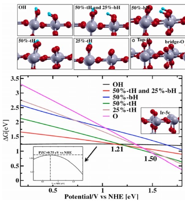 phase diagram)을 구현하여 작동 전압 하에서 어떤 표면 상태가 나타나는지를 예측하는 방법이 있다. 그림 6은 그 대표적인 예로써 대표적인 산소발생반응 촉매인 IrO2 의 표면에 대한 surface phase diagram을 구현하고 이로부터 유추된 표면 물 흡착 구조에서 메커니즘을 연구한 사례이다 [23]. -OH covered surface부터 –O covered surface 에 이르기 까지 surface free energy를 기술하여 각 작동