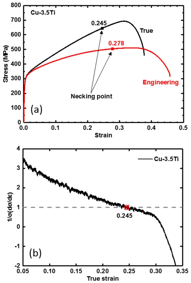 (a) Engineering and true stress–strain curves of solution treated Cu-3.5Ti alloy,