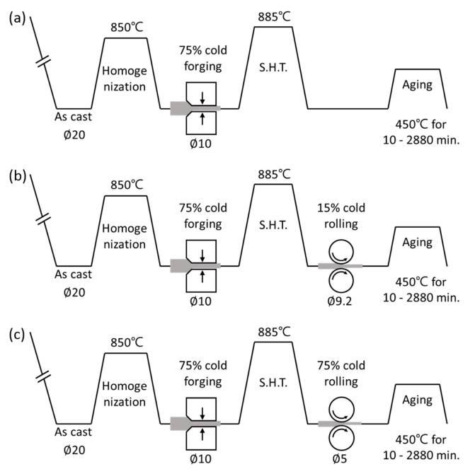 연구에서는 비교재로서, 용체화 처리한 시편과, 연구 대상 소재로서, 15% 그리고 75% 단면적 감소율로 성형한 시편을 450 °C에서 시효하여 석출물의