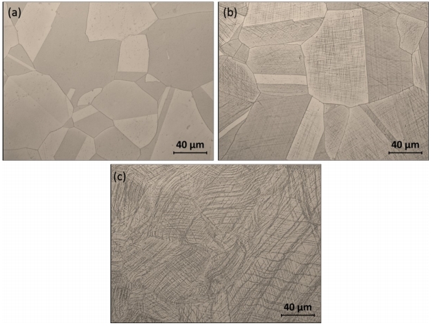 그림에서 나타낸 바와 같이, 용체화 처리된 시편과 달리 그림 3의 (b)와 (c)는 변형대(deformation band)가 생성된 것을 알 수 있다. 그리고 15% 단면적 감소율로 상온 성형 가공된 시편의 경우는 슬립 밴드(slip