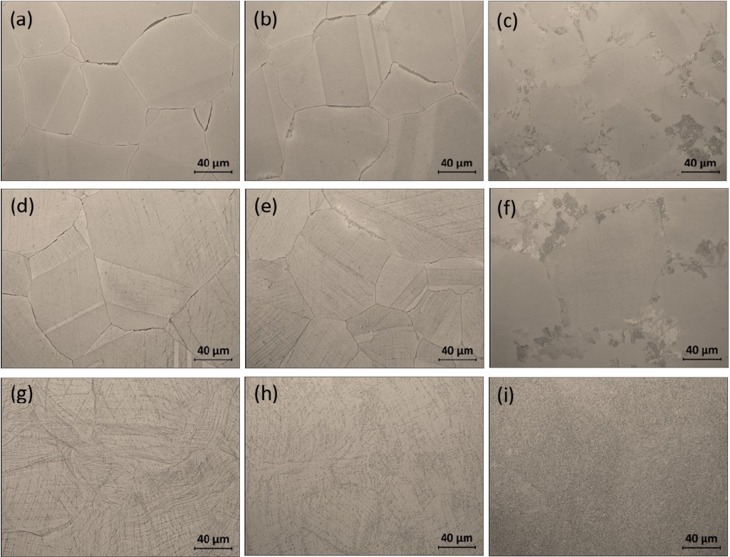 그림 3은 850 °C에서 용체화 처리, 그리고 용체화 처리 후 단면적 감소율 15%와 75%로 소성 가공한 Cu-3.5 wt% Ti 합금의 미세조직을 각각