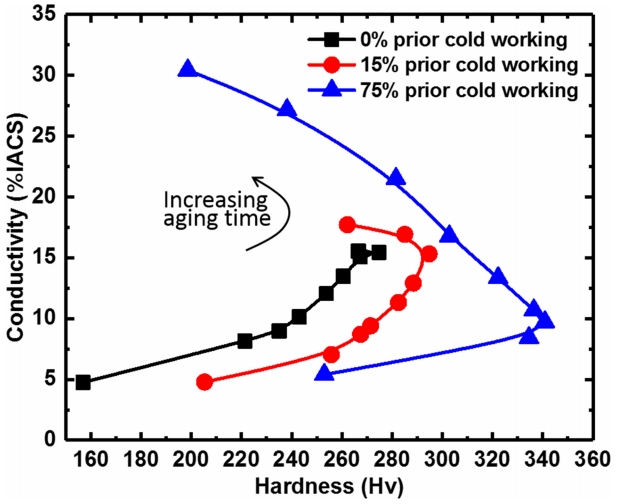 감소율 75% 시편의 경우 시효시간 30분에서 340 Hv, 전도도는 9.7% IACS이며, 반면에 용체화 처리 직후 시효한 시편은 시효 시간 1440분에서