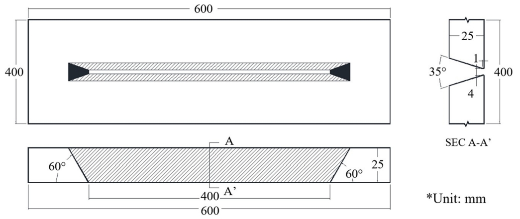 고온균열 평가는 폭 400 mm x 길이 600 mm의 모재에 그림 1과 같이 길이 400 mm의 홈(Groove) 가공을 실시하고 초층에 대해서 저전류(220 A) 및 고전류(280 A)의 2가지 조건으로 용접하였다.